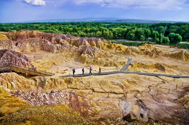 一岸是碧水綠樹溫潤(rùn),一岸是懸崖式雅丹地貌火熱,幾步之遙,竟是兩種水火不相容的景色。