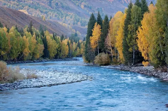 從布爾津川流而過(guò)的額爾齊斯河,是我國(guó)唯一一條向西流入北冰洋的河流。但是“一河隔兩岸,自有兩重天”,神奇的五彩灘就在這里。