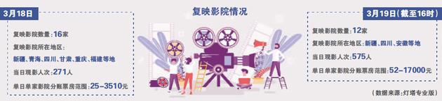 燈塔專業(yè)版數(shù)據(jù)顯示,3月18日,***、青海、四川、甘肅、重慶、福建等地共計(jì)16家影院已恢復(fù)放映,其中烏魯木齊人民電影院當(dāng)日觀影人次為117人,場均人次為8人,分賬票房收入3150元。3月19日截至16時,全國共計(jì)12家影院恢復(fù)放映,其中2/3均為***的電影院,其他影院則位于四川及安徽省。